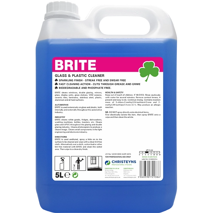 Glass Cleaner. A ready-to-use glass and plastic cleaner, which cuts through grease and dirt to leave a streak and smear-free, sparkling finish. Free from ammonia and abrasives, Brite ensures effective cleaning without unsightly chalk deposits. For general janitorial use, Brite is excellent for windows, double glazing, mirrors, glass, display units, glass shelves, VDU screens, ceramic tiles, laminates, stainless steel, aluminium and all hard surfaces. Ideal for use in hotels, offices, shops, stores, airports, public buildings and rooms, leisure centres and nursing homes.