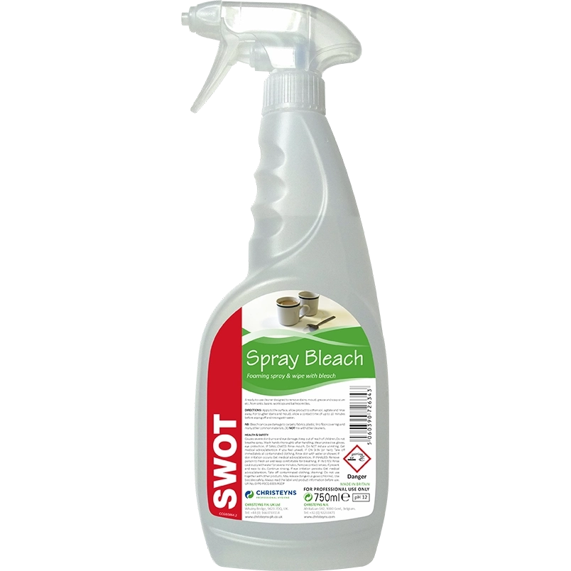 Spray Bleach Foaming spray wipe with bleach. A ready-to-use cleaner designed to remove stains, mould, grease and soap scum etc. from table tops, sinks, basins, worktops and bathroom tiles. NB: Bleach can cause damage to carpets, fabrics, plastic, lino floor coverings and many other common materials. DO NOT mix with other cleaners.